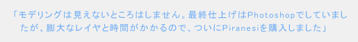 私はPiranesiを使っていなくて、MicroGDSとPhotoshopだけでパースを描いています。Photoshopの作業が多いですが、モデリングはほぼMicroGDSで行っています。MicroGDSでモデリングする際にいつも気をつけているのは、時間の削減のために、見えないところは全く作らない、ということです。たとえば、上のブレースのところなんかは見える部分だけちゃんとしていればいい、とけっこう適当です。モデリングでうまくできないものもPhotoshopで描いてしまったりしています。この作品ではPhotoshopでレイヤをたくさん作っています。ガラスだけのレイヤとかを別にしておき、反射、映り込み、光を当てたりしていますが、こういうことをPhotoshopでやると膨大なレイヤと時間がかかっていました。で、頑固だった私もついに去年Piranesiを買いまして、これからはきっと、もっとすばらしい、今までになかった表現ができるのではないかと思っています。