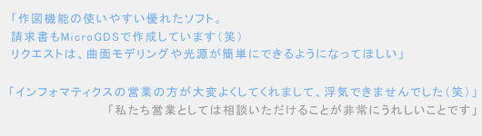 請求書にパースを貼り付けて、楽しい感じで請求させていただいています。MicroGDSは図面も描けますし、いろんな機能があって使いやすいと思います。実際的に図面をまとめる仕事もしていましたので、作図機能の優れたCADソフトだと思います。なぜ私がMicroGDSから離れないかというと、インフォマティクスの営業の方が大変よくしてくれまして。ここの会社は本当に親身になっていろいろサポートとかをやってくださるので、それで他には浮気ができなかったんです。