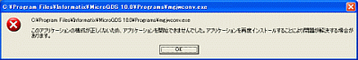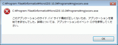 インストール方法 | ダウンロードした「jww_tran_0909.zip」を、MicroGDSのインストールフォルダを解凍先に指定して展開します。 例:C:\Program Files\Informatix\MicroGDS 10.0以下の5つのファイルが、Programsフォルダ内に展開されます。 mgjwconv.exe jwwclose.bmp jwwexport.bmp jwwopen.bmp linestyle.lmp 起動や使用方法、変更点などにつきましては、こちらをご覧ください ![]() ご利用のPCが、Microsoft Windows Updateなどで自動更新されていない場合、 「mgjwconv.exe」をダブルクリックしたとき、次のようなエラーメッセージが表示されることがあります。 これは、JWWトランスレータ0909版の動作には、Microsoftのセキュリティアップデートされたランタイムライブラリが必要なためです。 ・Windows XP ![]() ・Windows Vista ![]() 上記のエラーが発生した場合は、以下の手順でMicrosoftのセキュリティアップデート実施済みのランタイムライブラリをインストールしてください。