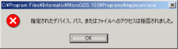 ![]() JWWトランスレータをインストールしたユーザ(通常はAdministratorユーザ)以外のユーザでログインし、「mgjwconv.exe」をダブルクリックすると、次のエラーメッセージが表示される場合があります。 これは、JWWトランスレータのファイルのアクセス権が、他のユーザで利用できない設定になっているためです。 ![]() 上記のエラーが発生した場合は、JWWトランスレータをインストールしたユーザでログインし、以下のファイルのアクセス権に「Everyone」を追加してください。 mgjwconv.exe jwwclose.bmp jwwexport.bmp jwwopen.bmp jwwopen.bmp