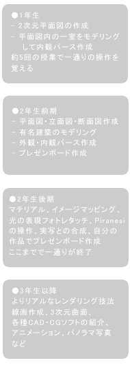 3年生以降は、よりフォトリアルなレンダリング技法や、逆に簡単な線画のパースを作る方法、3次元曲面をくねくね面白い形で作るにはどうすればよいか、また、別のCADやCG製品の紹介もします。アニメーションやパノラマの写真などをどういう風に作ったらよいかも話します。