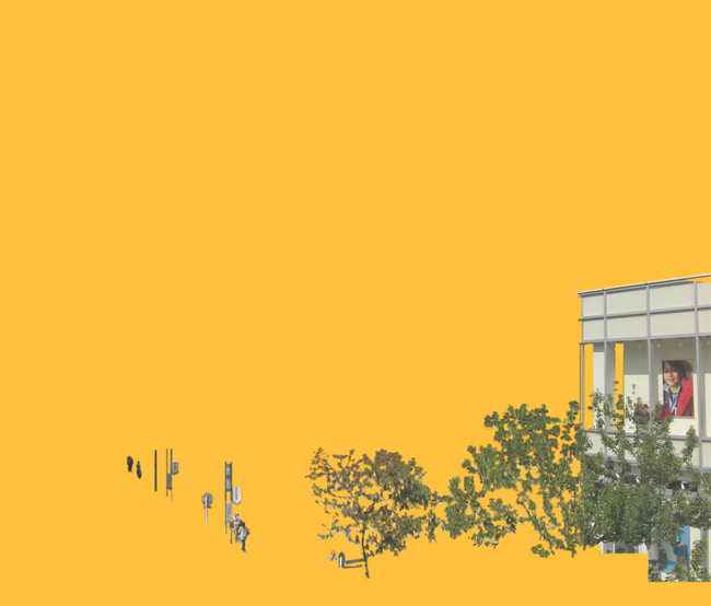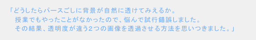 どうしたらパースごしに背景が自然に透けて見えるのかということを、今まで授業でやったことがなかったので、悩んで試行錯誤した結果、透明度が違う2つの画像を透過させる方法を思いついたのですが、思いつくまで時間がかかって大変でした。また、写真とCGと違和感なく合成させるために、消えてしまった木とかを選択する作業は、単純ですが時間がかかって疲れました。