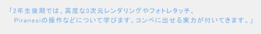 2年生後期には、マテリアル設定、イメージマッピングの設定、光の表現、フォトレタッチについて学びます。ここまで来ると、自分たちのやりたいこと、レイアウト技法、配色なんかにもこだわりが出てくるようになり、コンペ等にも出せる実力がついてきます。授業では、即日課題に近い、1回の授業だけで提出させています。もっと難しいことをということで、Piranesiの使い方、実写との合成なども課題として、自分の作品をプレゼンシートにレイアウトして発表してもらう、という授業になっていきます。あとは、卒業設計、学生コンペ等々にみなさんどんどん参加してください、ということで、ここで大体CADの授業はおしまいです。