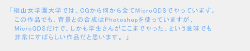 椙山女学園大学では、CGから何から全てMicroGDSでやっています。この作品でも、背景との合成はPhotoshopを使っていますけれど、MicroGDSだけで、しかも学生さんがここまでやった、という意味でも非常にすばらしい作品だと思います。