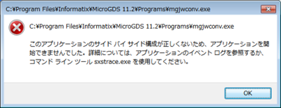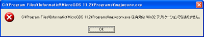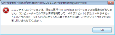 | 起動方法 | MicroGDS V11.2を起動し、MicroGDSのインストールフォルダ内、「Programs」フォルダにある「mgjwconv.exe」をダブルクリックします。 ツールバーに、「JWW」ツールバーが登録されます。 ※OSとMicroGDSの組み合わせとJWWトランスレータが適合していない場合、「mgjwconv.exe」をダブルクリックしたとき、以下のエラーメッセージが表示されます。その場合は、上記「ダウンロード」欄に記載されている適切なトランスレータをご利用ください。 ●「32bitOS」+「32bit版MicroGDS」+「64bit版JWWトランスレータ」の場合 ![]() または ![]() ●「64bitOS」+「64bit版MicroGDS」+「32bit版JWWトランスレータ」の場合 使用方法、MicroGDSメニューへの登録(任意)などにつきましては、こちらをご覧ください。 |