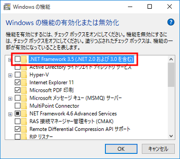 一覧の中から、「.NET Framework 3.5(.NET 2.0 および 3.0 を含む)」の先頭の□をクリックして■にしたのち、「OK」ボタンをクリックします。