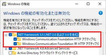 一覧の中から、「.NET Framework 3.5(.NET 2.0 および 3.0 を含む)」の「+」をクリックして展開し、下図の赤枠内の3つの項目の先頭の□をクリックして■にしたのち、「OK」ボタンをクリックします。