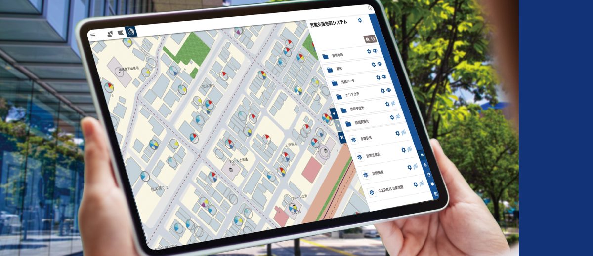 本システムは、高機能かつ軽快に動作する WebGIS(地図システム)で、スマホやタブレットなど、さまざまな環境でご利用いただけます。