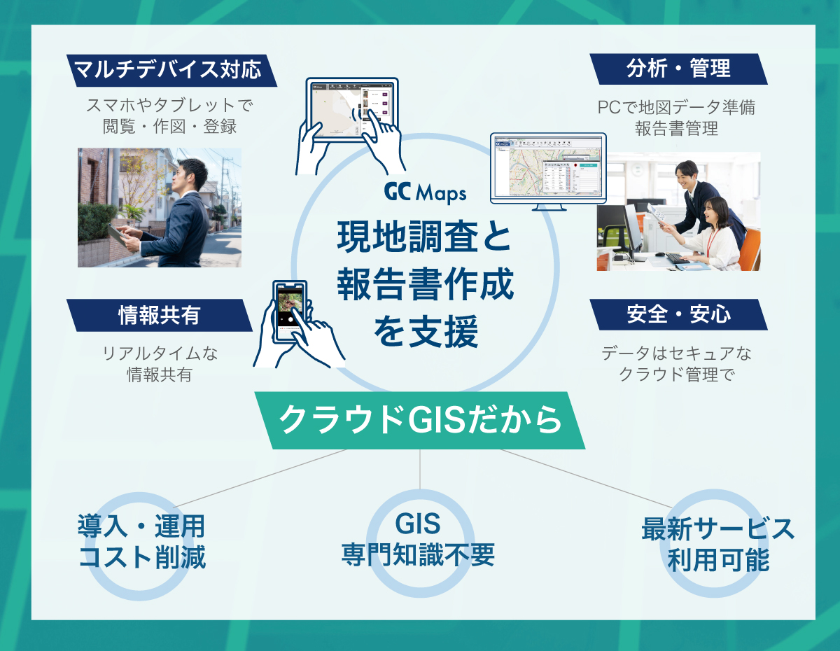 GC Maps(ジーシー マップス)は、GIS専用のサーバー構築や面倒なソフトウェア更新が不要なクラウドGISサービスです。屋外での調査・点検業務で写真や調査情報の登録、オフィスでの結果報告の共有に利用できます。マルチデバイス対応で、PCやタブレット、スマートフォンでWebから閲覧・作図・登録が可能、即座にユーザー間で情報共有できます。