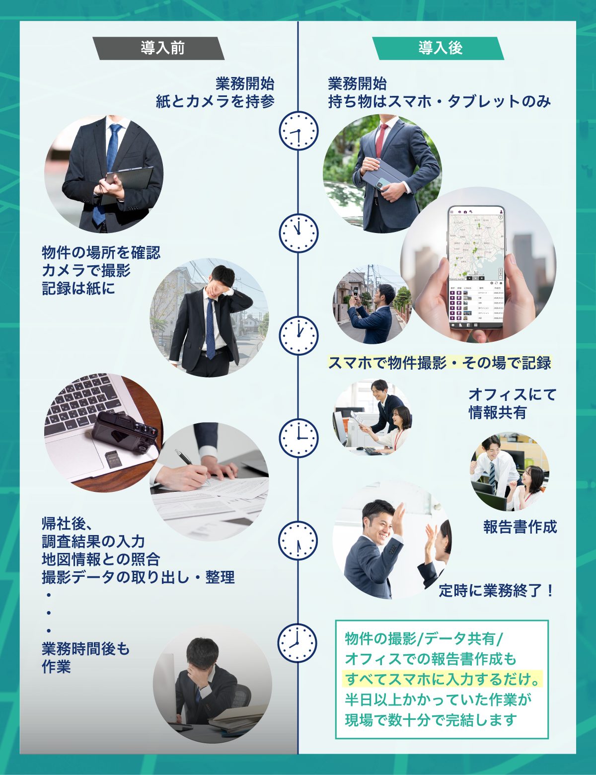 スマホやタブレットのみを持参し、現地で物件を撮影してその場で記録。データはオンラインで即時、オフィスの担当者へ共有できます。報告書の作成時間は半分以下となり、従来半日以上かかった作業が現場で数十分で完結します。