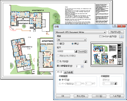 図面の印刷範囲が1ページに収まらない場合、複数ページにわたっての印刷が可能です。