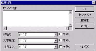 メニュー「設定/編集」では、オブジェクト名、線種名、文字種名、マテリアル名で編集制限をかけることができます。
