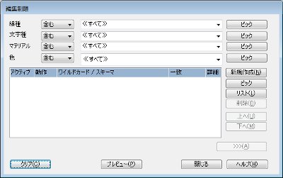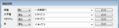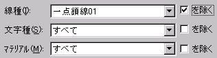それぞれのボックスから線種、文字種、マテリアル名を選択します。「を除く」を選択すると、